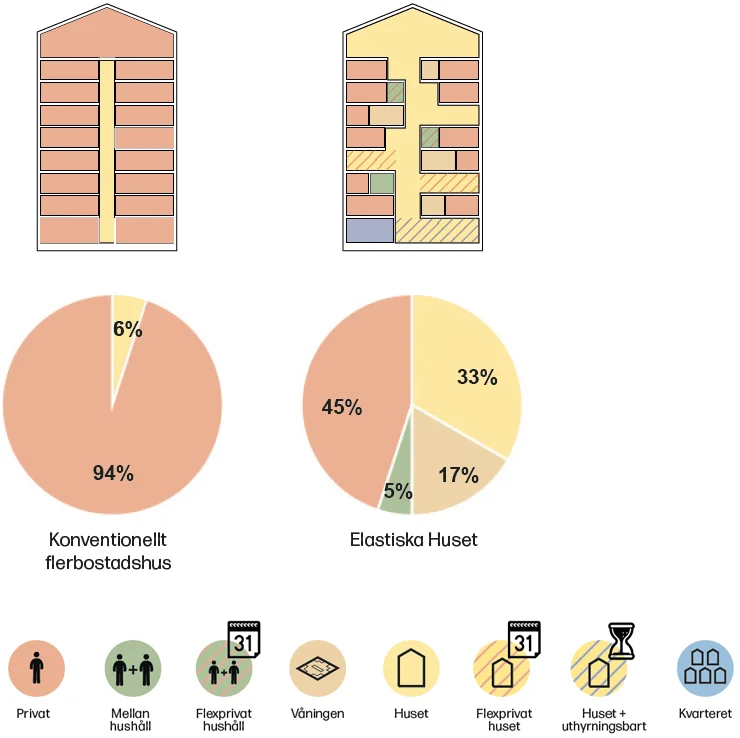 Det Elastiska Huset är ett flerbostadshus, i vår prototyp tänkt som ett nybyggt punkthus i ett stadsutvecklingsområde, som ska kunna tillgodose de boendes olika behov oavsett var i livet de befinner sig. Genom att bo på en mindre privat yta kan de boende i gengäld få tillgång till kvalitativa gemensamma ytor och funktioner som kök, klädvård, bad, rum för stillhet, bytesrum samt mångfunktionella rum för samvaro, lek eller arbete. Huset delas in i olika trygghetszoner, värmezoner och grader av privathet. Ytorna ska kunna användas flexibelt, till olika ändamål och över dygnets alla timmar.