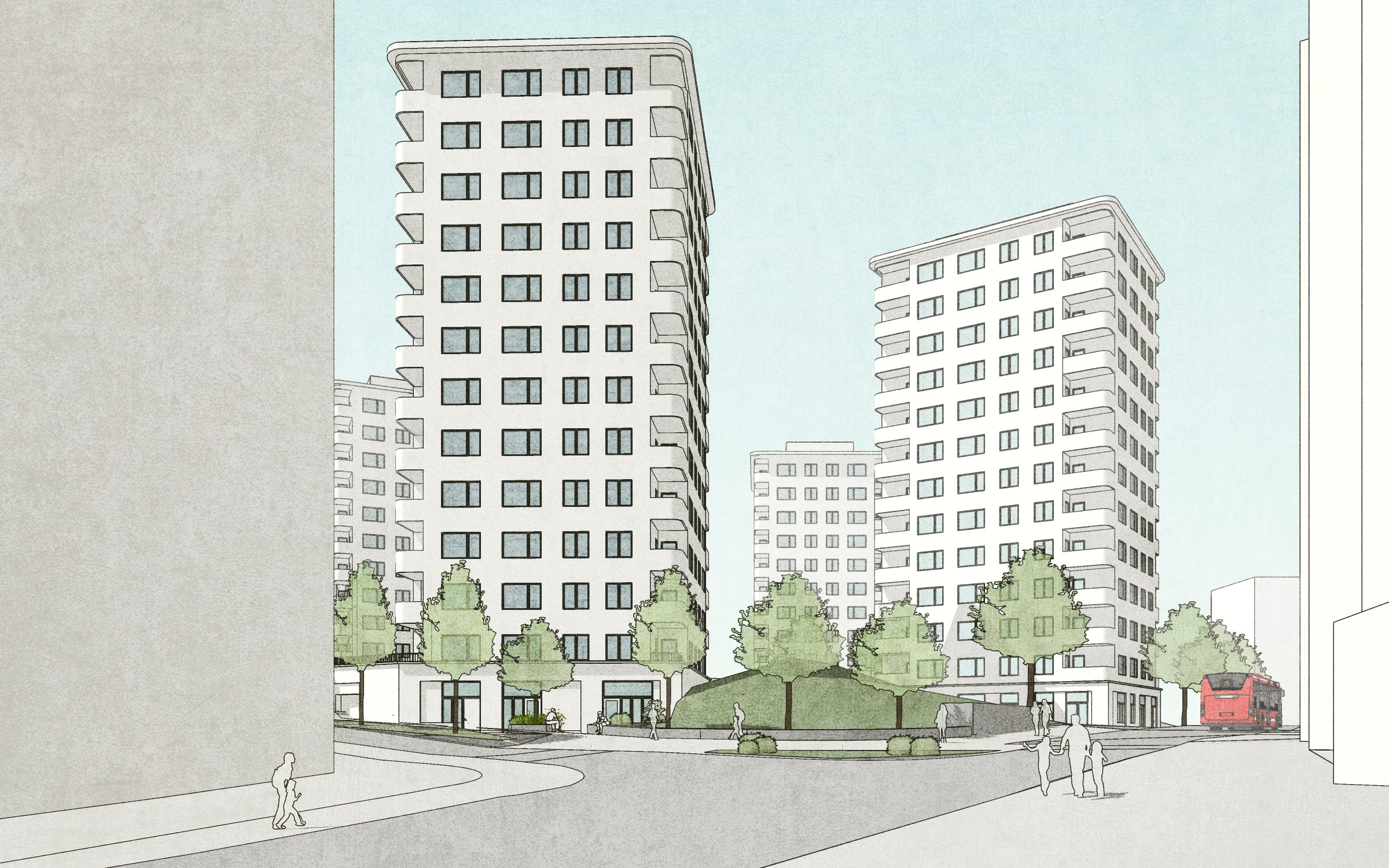 I detaljplanen för Filipstadsbacken föreslås fem punkthus på höjden inramade av befintliga lamellhus. Husen passas in mellan tallar och berghällar.
