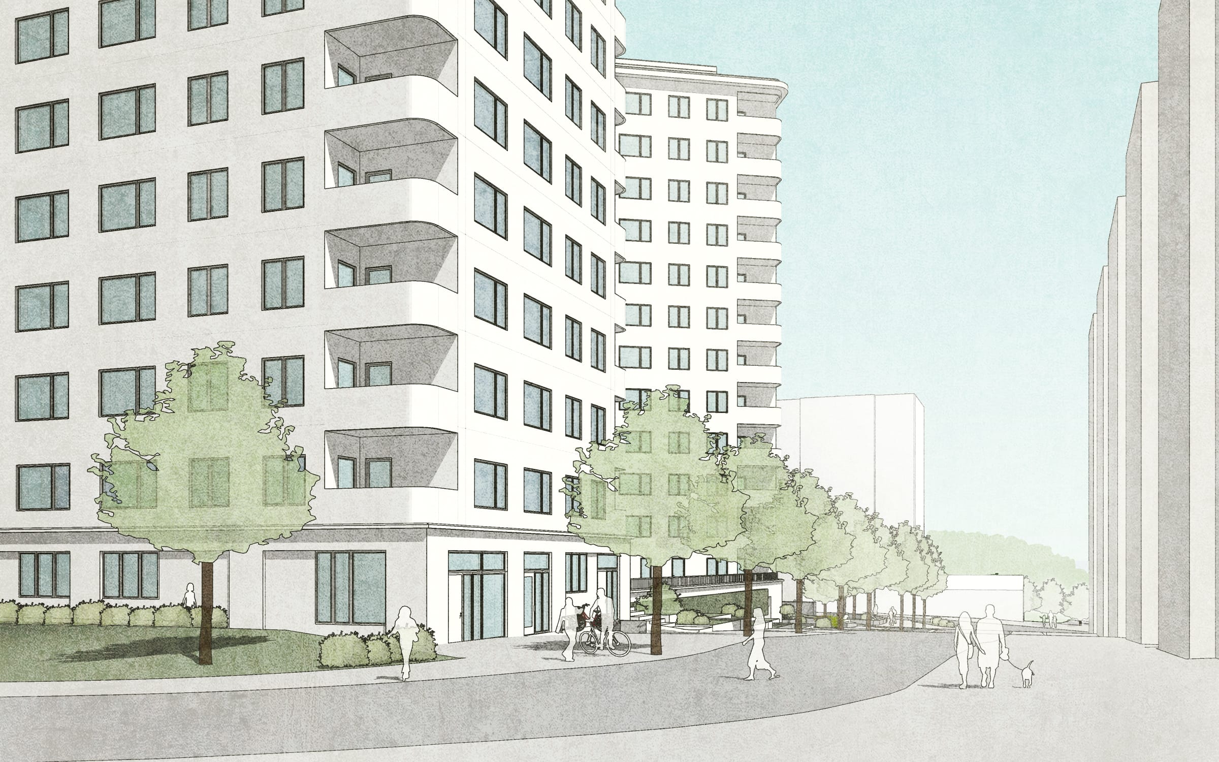Fasaden på sockeln kläs i sten eller betong som knyter an till platsens berg i dagen. Socklarna detaljeras genomgående med ett motiv av indragna reliefer vilket ger dem en tyngd, rytm och en mer mänsklig skala. Stora entrépartier och fönster i trä ger värme och öppenhet mot gaturummet. De solida punkthusen är klädda med träspån eller annan träpanel. Med rundade balkonger och en genomgående enhetlig gestaltning kan de liknas vid robusta trädstammar som tittar fram mellan lamellerna. De tre kvarteren har en sammanhållen karaktär, men omsorgsfulla variationer i detaljerna som upplevs på nära håll bidrar till identitet och orienterbarhet.