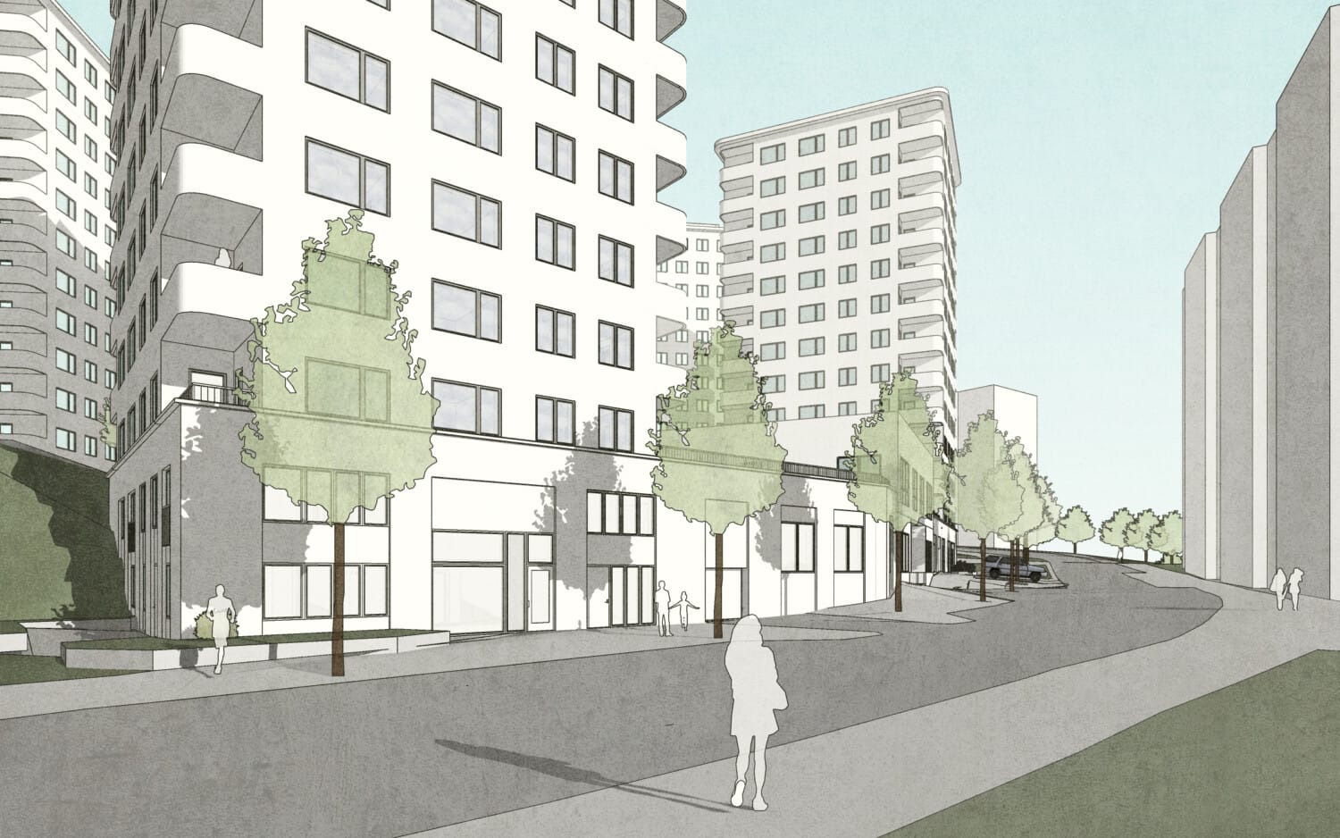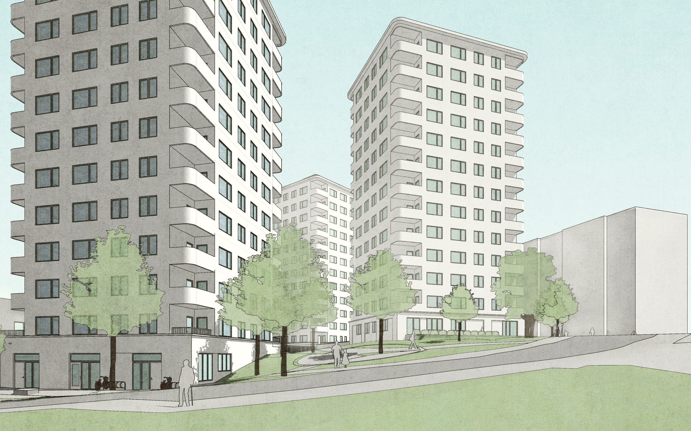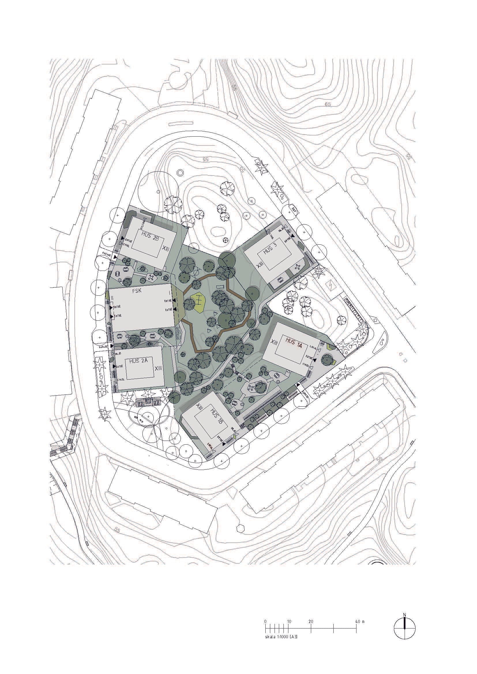 Punkthusen sitter ihop parvis med entrévåningar i suterräng, dessa bildar en sockel som ansluter sömlöst mot naturmarken i bakkant. Socklarna rymmer parkering, bostadsentréer, miljörum, cykelrum, personalingång till förskolan mm. Entrévåningarnas tak blir till bostadsgård. Entréerna är platsanpassade och har en generös takhöjd.