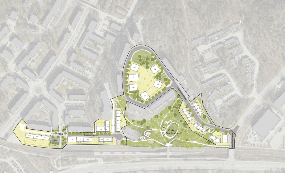 Bild 1: illustrationsplan som visar föreslagen bebyggelsestruktur samt gator, torg, park och naturmark. © Stockholms stad med underlag från WSP.