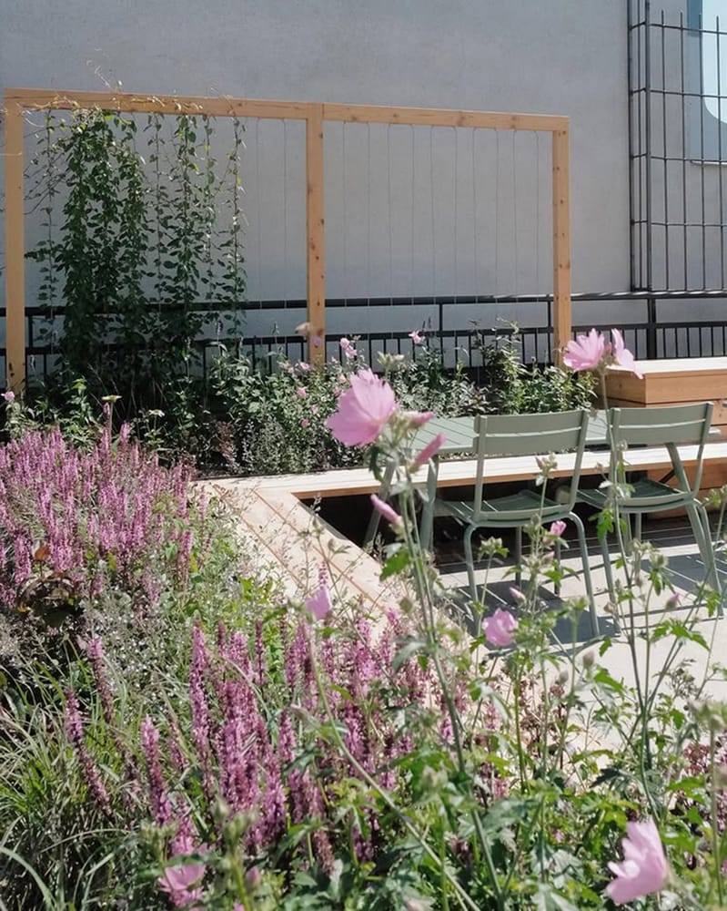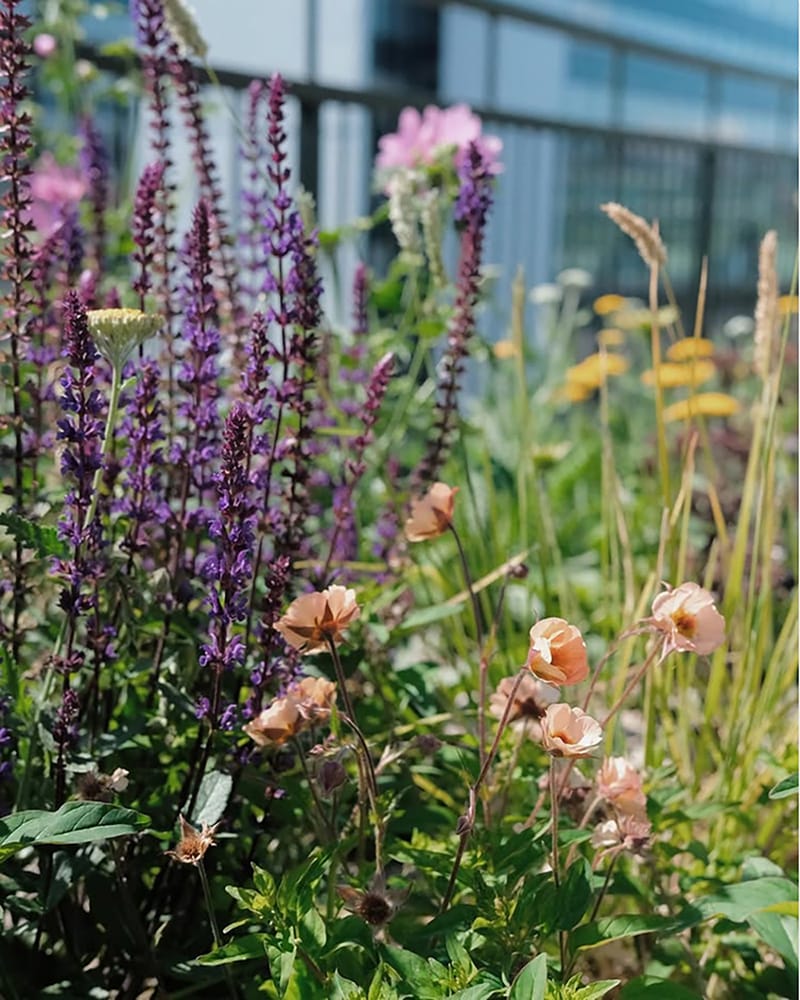 En takterrass för pauser i kontorsarbetet där riklig grönska med varierad blomning över hela växtsäsongen bidrar både till återhämtning och en rad urbana ekosystemtjänster.