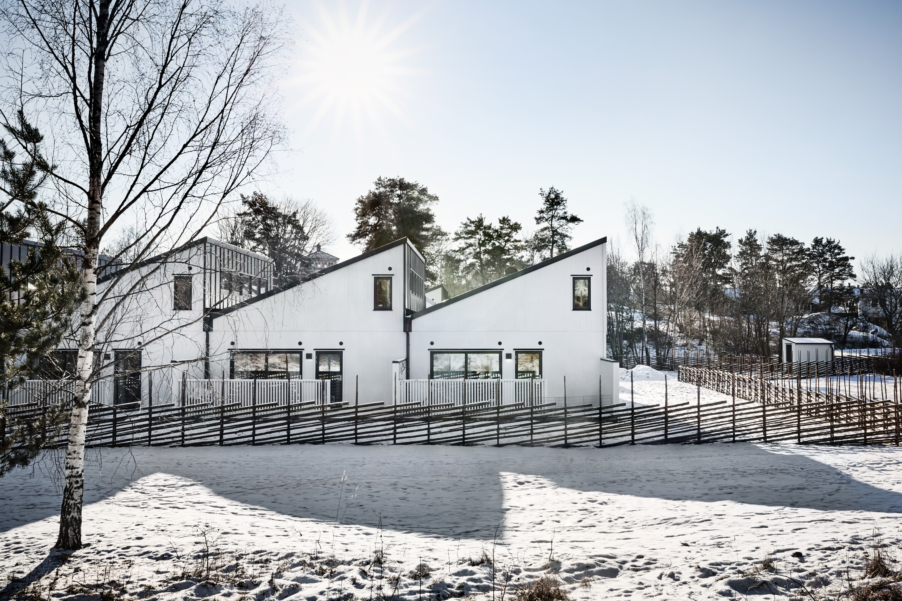 För att knyta an till Gustavsbergs fabrikshistoria har radhuslängorna sin utformning inspirerad av industribyggnadernas formspråk. Sågtandade tak och sammanhållna volymer.