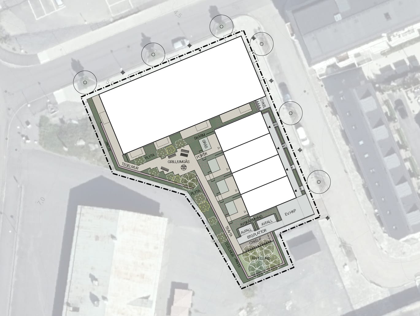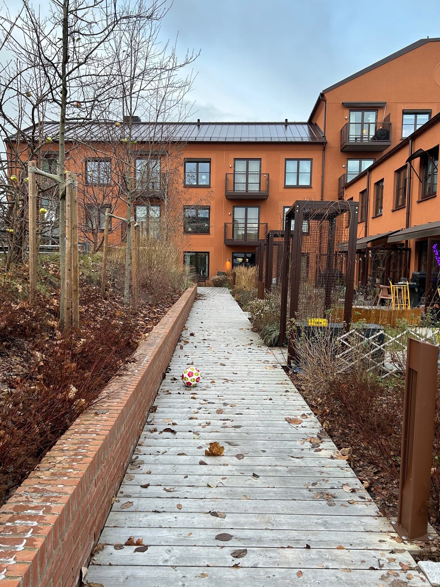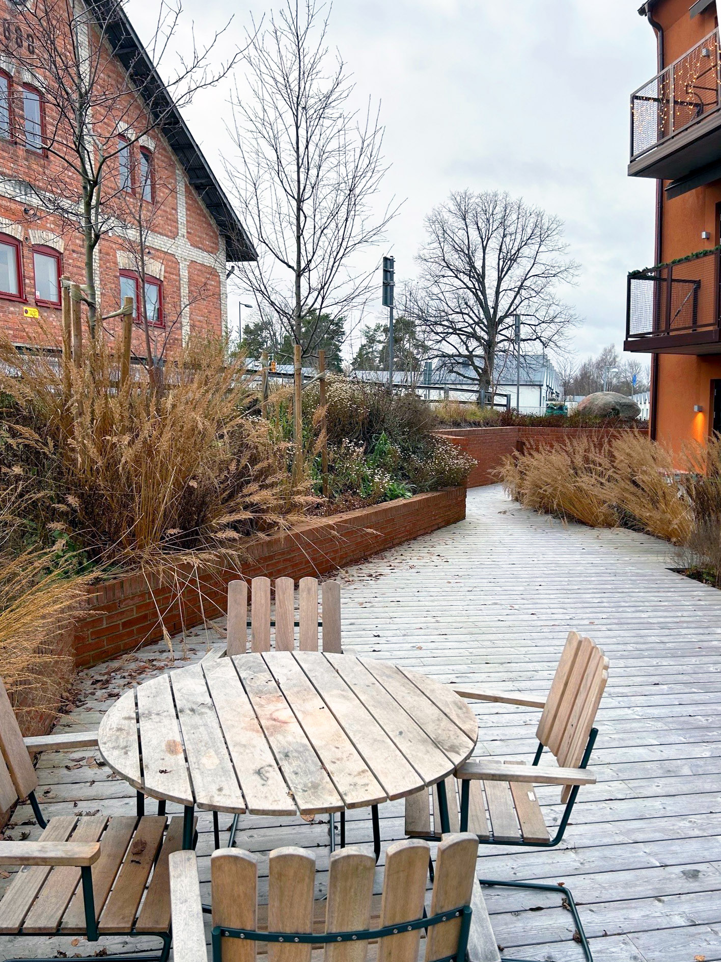 Tomten rymmer två husvolymer, den ena med radhus och den andra med lägenheter i flerfamiljshus. Den gemensamma gården har vi utformat som ett generöst trädäck som anspelar på bryggor och pirar som finns i Värmdös skärgårdslandskap. De boende i radhusen når däcket från sin egen uteplats genom en spaljéportik som tydliggör gränsen mellan privata och delade ytor. Trädäcket ansluter till en generösa och artrika planteringsytor där prydnadsgräs och perenner dominerar. Vi har också plockat upp materialet rött tegel som är vanligt förekommande i äldre industribyggnader i Gustavsbergs porslinskvarter. Teglet används i en lång stödmur som ramar in gården och tar upp höjdskillnad på tomten. Längst i söder finns också en gemensam fruktlund med olika arter av äppelträd som de boende delar.
