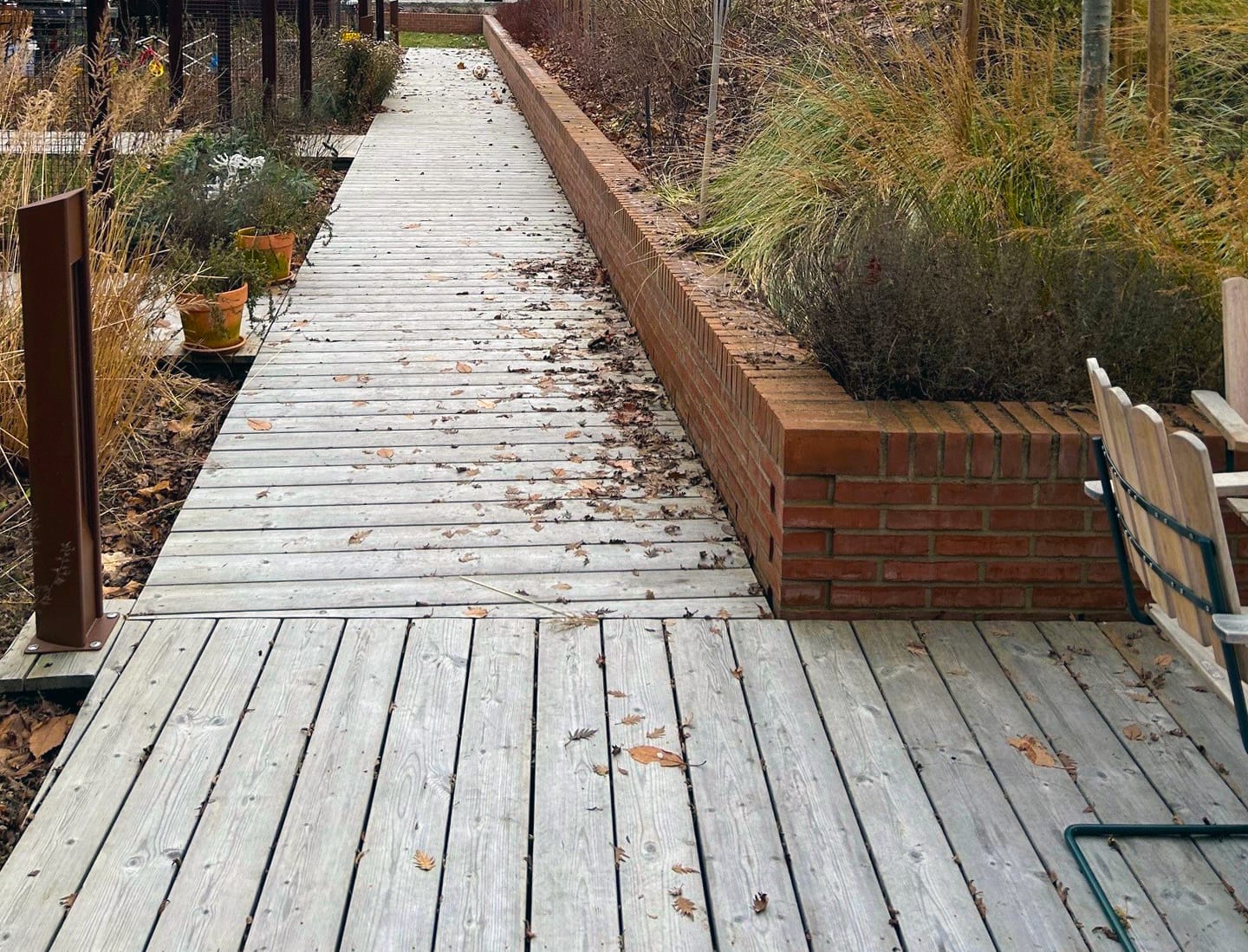 Tomten rymmer två husvolymer, den ena med radhus och den andra med lägenheter i flerfamiljshus. Den gemensamma gården har vi utformat som ett generöst trädäck som anspelar på bryggor och pirar som finns i Värmdös skärgårdslandskap. De boende i radhusen når däcket från sin egen uteplats genom en spaljéportik som tydliggör gränsen mellan privata och delade ytor. Trädäcket ansluter till en generösa och artrika planteringsytor där prydnadsgräs och perenner dominerar. Vi har också plockat upp materialet rött tegel som är vanligt förekommande i äldre industribyggnader i Gustavsbergs porslinskvarter. Teglet används i en lång stödmur som ramar in gården och tar upp höjdskillnad på tomten. Längst i söder finns också en gemensam fruktlund med olika arter av äppelträd som de boende delar.