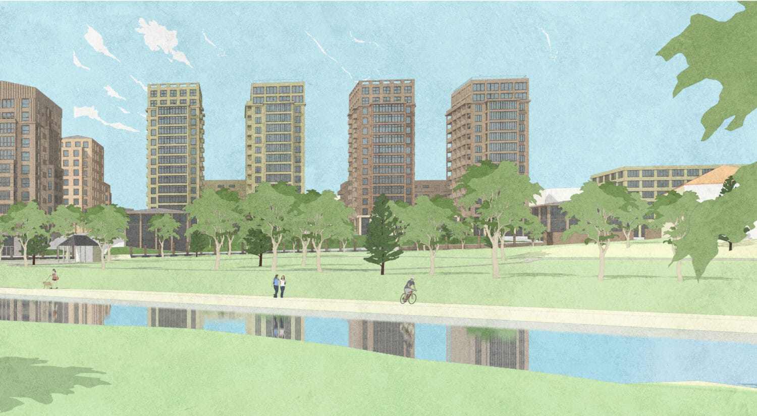 När järnvägen genom Sundbyberg 2038 har överdäckats, ska en ny stadsdel byggas. Förslaget för västra delen av Sundbybergs nya stadskärna visar en tät stad där allt byggs i trä och de gröna offentliga rummen är prioriterade.