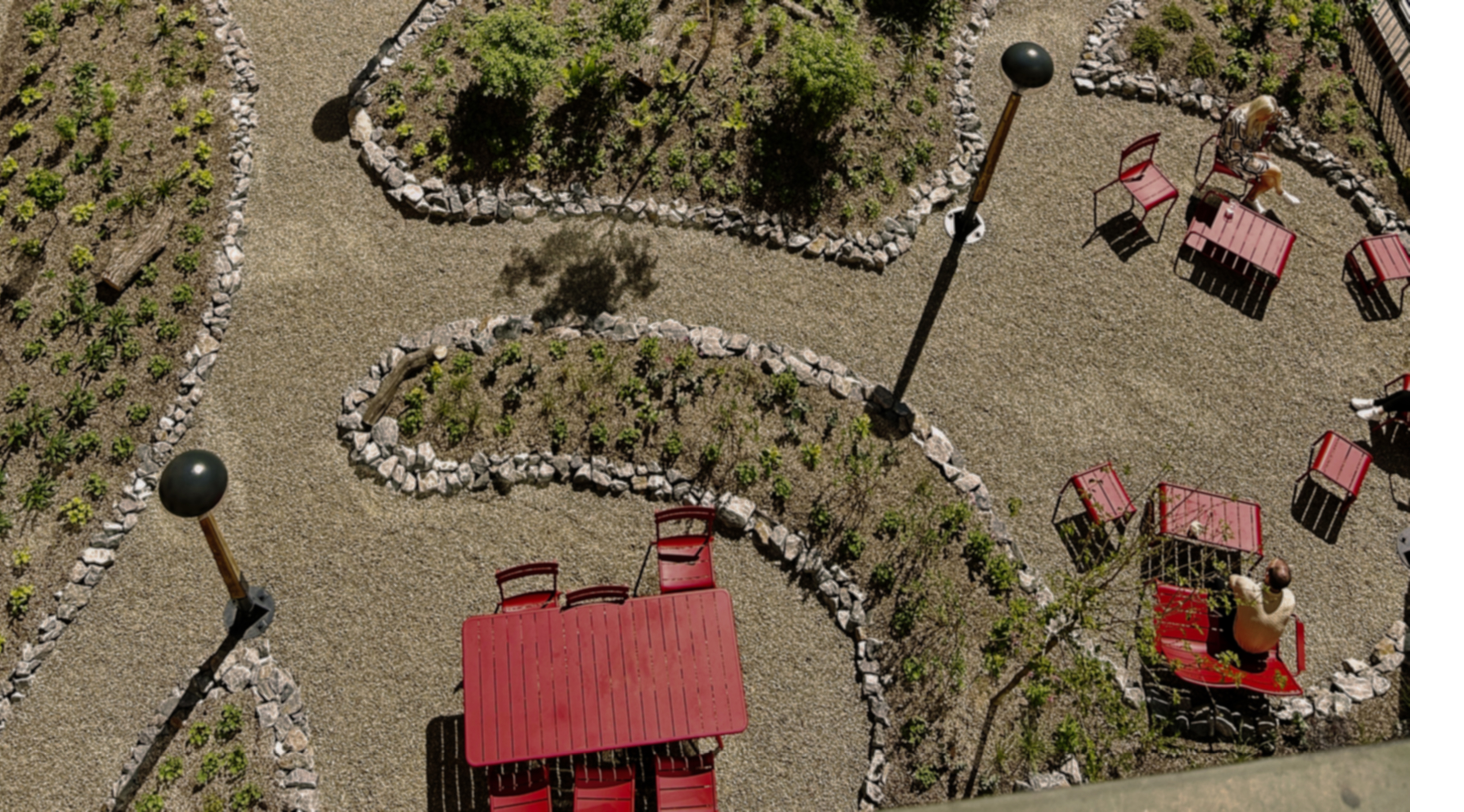 Gården är gestaltad med organiska former, stålmöbler och grus – en materialpalett inspirerad av gruvmiljöer och det lokala industriarvet. Genom att knyta an till den närliggande verksamheten skapas en stark identitet och en tydlig känsla av plats.