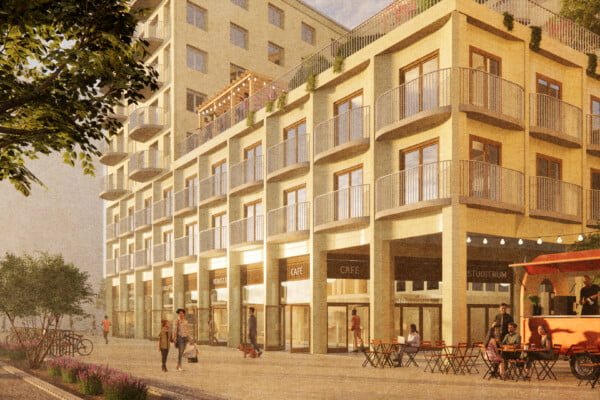 Konceptcollage: Nya byggnadshybrider där en kombination av höga och låga delar ger en intressant helhet i mänsklig skala