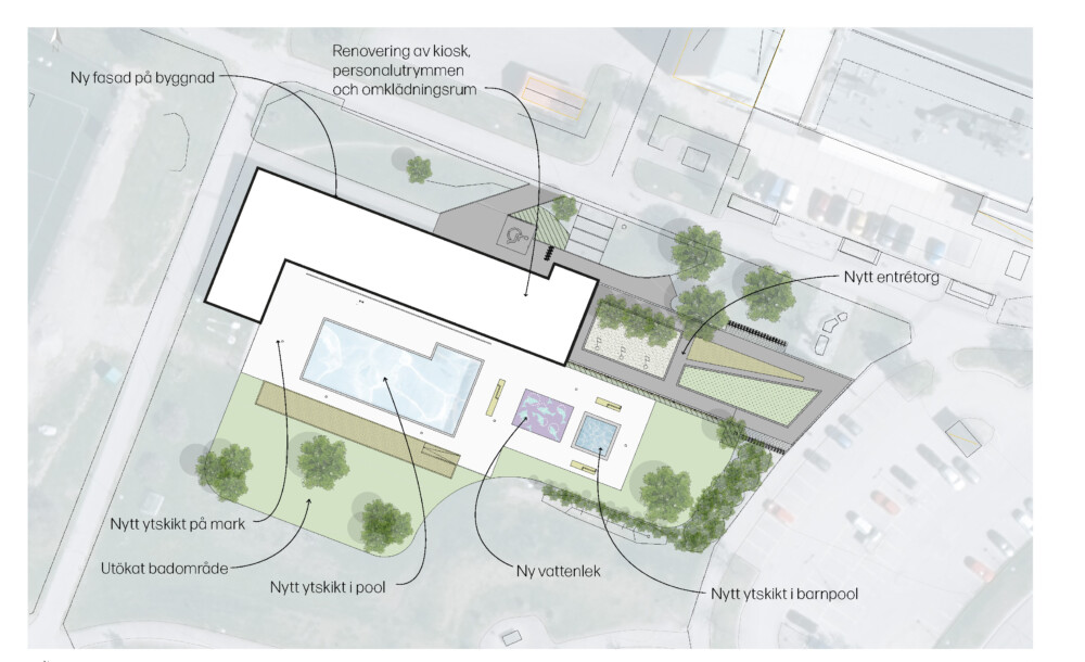 Byggnaden har fått nytt glest ribbverk i trä till fasader, samt nya plank, grindar, sittbänkar, fönsterluckor och cafédiskar som ger ett nytt uttryck till den lilla byggnaden. Badet har även fått en ny entrésituation med ett nytt välkomnande entrétorg samt nya markmaterial och trädäck vid poolerna som ger bättre vistelseytor. En helt ny vattenlek för de minsta barnen adderas till utemiljön.