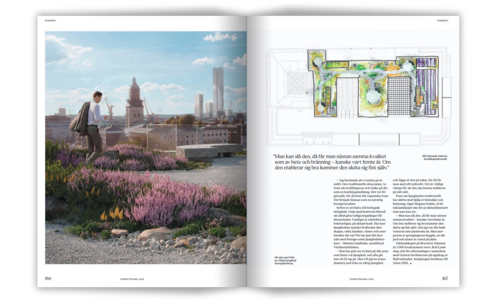 I senaste numret av RUM går det att läsa om Kv Johannas taklandskap, som ritats av Kod Landskap. Den kustnära ljungheden har varit koden för takets gestaltning. Att odla ljung är en komplex uppgift och vi ser med spänd förväntan fram emot att se växtligheten ta över taket när huset är färdigbyggt. Resten av kvarteret är ritat av General Architects.